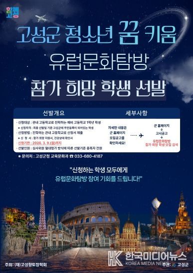 [ 한국미디어뉴스 이원영 기자 ] 평화 경제 거점 도시 강원 고성군의 (재)고성향토장학회는 관내 청소년들에게 국제적 시야를 넓히고 진로 탐색의 기회를 제공하기 위해 '2026년 청소년 꿈 키움 유럽문화탐방' 참가 희망 학생을 선발한다.