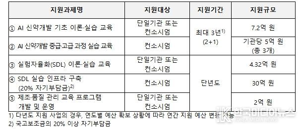 이번 공모를 통해 최대 7개 수행기관을 선정하며, 지원기간은 과제별로 구분하여 지원한다. 지원과제는 AI 신약개발 기초 이론·실습 교육, 중급·고급 과정 실습 교육, 실험자율화 이론·실습 교육, 실험자율화 실습 인프라 구축, 제조·품질 관리 교육까지 총 5개 단위이다.