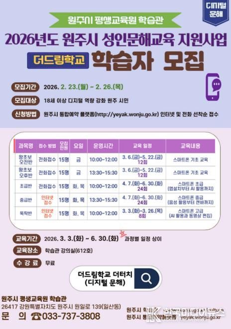 [ 한국미디어뉴스 이원영 기자 ] 원주시 평생교육원 학습관은 오는 23일부터 26일까지 더드림학교 더터치반(디지털 문해교육) 수강생을 모집한다.