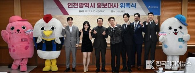 [ 한국미디어뉴스 이원영 기자 ] 인천광역시는 2월 13일 인천 유나이티드 FC 서포터스, 가수 허각·이도진·유수현, 아나운서 정영한, 코미디언 송하빈, 인플루언서 최승열(활동명: hotdor_s), 시민 김주현 등 8팀을 인천시 홍보대사로 위촉했다.