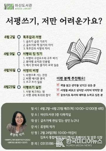 [ 한국미디어뉴스 이원희 기자 ] 김포시 마산도서관은 오는 4월 2일부터 23일까지 매주 목요일 오전 10시부터 12시까지 성인 대상 글쓰기 특강 ‘서평쓰기, 저만 어려운가요?’를 운영한다.