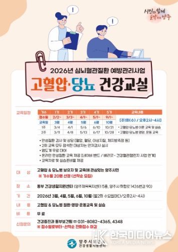 [ 한국미디어뉴스 김서안 기자 ] 양주시보건소 동부 건강생활지원센터에서는 시민의 심뇌혈관질환 예방과 만성질환 관리를 위해 '2026년 고혈압·당뇨병 건강교실'을 운영한다.