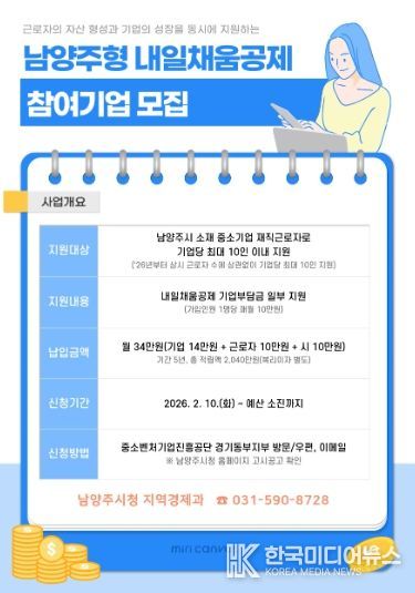[ 한국미디어뉴스 김서안 기자 ] 남양주시는 관내 중소기업 핵심 인력의 장기근속 유도와 고용 확대를 위해 ‘2026년 남양주형 내일채움공제’지원사업 참여기업을 모집한다고 13일 밝혔다.