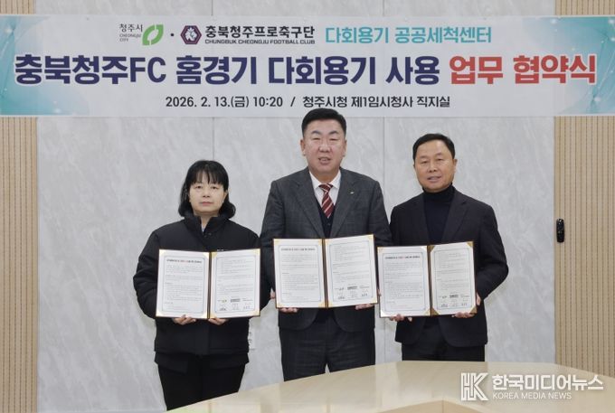 [ 한국미디어뉴스 이원영 기자 ] 청주시는 13일 충북청주 프로축구단(충북청주FC), 다회용기 공공세척센터와 함께 충북FC 홈경기 다회용기 사용 확대를 위한 업무협약을 체결했다.