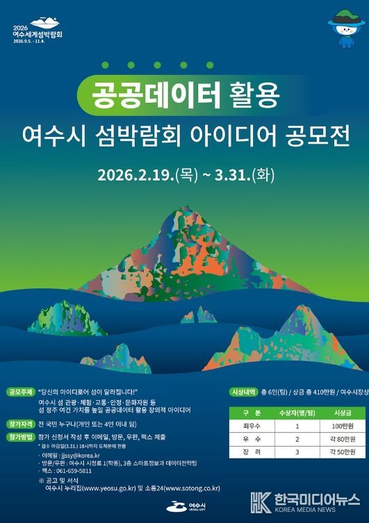 [ 한국미디어뉴스 이종철 기자 ] 여수시가 공공데이터를 활용해 섬 지역 현안을 해결할 창의적인 정책 아이디어 발굴을 위해 ‘공공데이터 활용 여수시 섬박람회 아이디어 공모전’을 개최한다고 밝혔다.