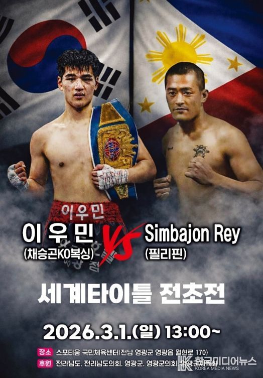 [ 한국미디어뉴스 이종철 기자 ] 영광군은 28일부터 3월 1일까지 2일간 2026 전국생활복싱대회 및 이우민 세계타이틀 전초전을 스포티움 국민체육센터에서 개최한다고 밝혔다.