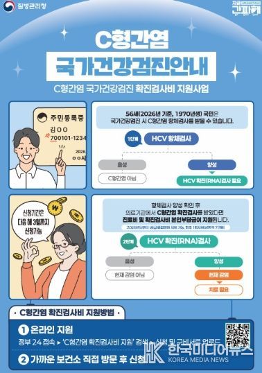 질병관리청은 2026년부터 56세(1970년생)를 대상으로 국가건강검진에서 C형간염 항체 양성 판정을 받은 경우, 확진 검사비 지원 의료기관을 기존 병·의원급에서 상급·종합병원까지 포함한 모든 의료기관으로 확대한다. 지원 항목은 진찰료와 검사비 본인부담금이다. 1회 최대 7만 원을 지원한다.