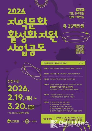 나주문화재단은 ‘2026 지역문화 활성화 지원사업’ 공모를 오는 3월 20일 오후 4시까지 진행한다고 19일 밝혔다.