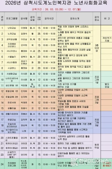 [ 한국미디어뉴스 이원영 기자 ] 삼척시도계노인복지관은 2026년도 노년사회화교육 프로그램 개강을 앞두고 수강생 모집을 시작했다.