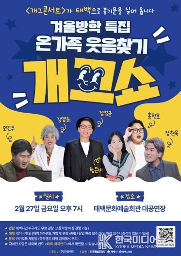 [ 한국미디어뉴스 이원영 기자 ] 태백시는 겨울방학을 맞아 오는 2월 27일 오후 7시 태백문화예술회관 대공연장에서 '온가족 웃음찾기 개그쇼'를 개최한다고 밝혔다.