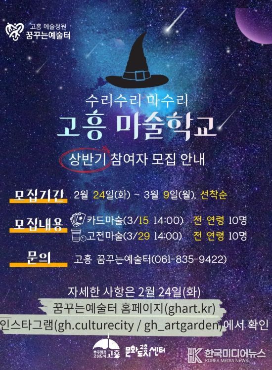 [ 한국미디어뉴스 이종철 기자 ] 고흥군은 마술을 매개로 창의력과 집중력, 자신감을 기를 수 있는 체험형 문화예술교육 프로그램인 ‘수리수리 마수리 '고흥 마술학교'’의 상반기 참여자를 모집한다.