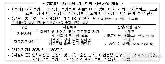 2026년에는 대학들이 고교학점제 시행, 2028 대입개편안 도입 등 대입 환경 변화에 안정적으로 대응할 수 있도록, 연차평가를 통해 작년 사업의 성과와 향후 계획을 점검할 계획이다.