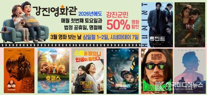 [ 한국미디어뉴스 이종철 기자 ] 강진군이 군민의 문화 향유 기회를 넓히고 지역 영화관 활성화를 위해 매달 운영 중인 ‘영화 보는 날’ 행사를 3월에도 추진한다.
