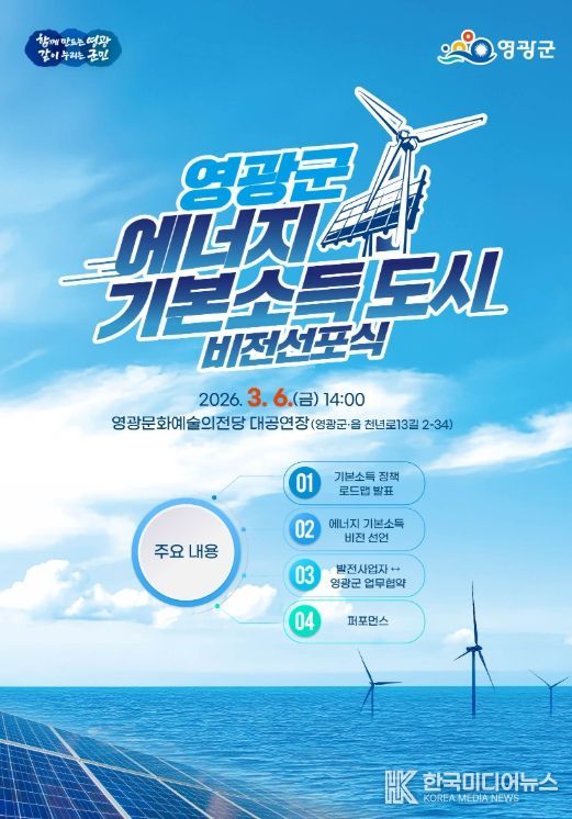 군은 2026년 3월 6일 오후 2시, 영광문화예술의전당 대공연장에서 '영광군 에너지 기본소득 도시 비전선포식'을 개최한다고 밝혔다.