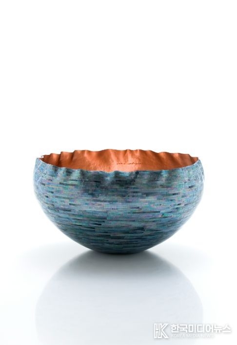 'Blue Wave No.5'는 한국 전통 자개 공예의 ‘끊음질’ 기법을 현대적으로 확장한 작품으로, 금속 기형 위에 자개를 한 조각씩 붙여 밀도 높은 표면을 구축한 것이 특징이다.