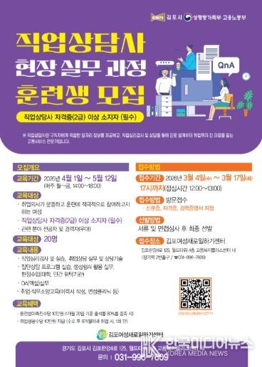 [ 한국미디어뉴스 이원희 기자 ] 김포여성새로일하기센터는 고용서비스의 질적 향상과 경력단절 예방을 위해 '직업상담사 현장실무 과정' 훈련생을 모집한다.
