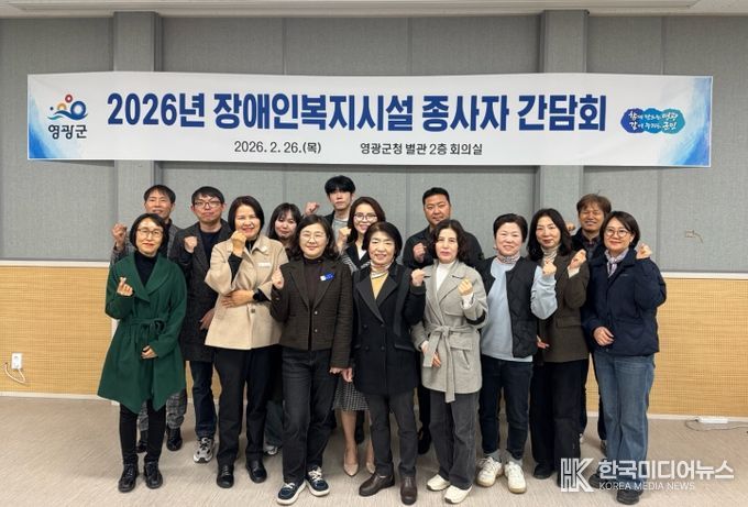 [ 한국미디어뉴스 이종철 기자 ] 영광군은 지난 2월 26일 영광군청 별관 회의실에서 관내 장애인복지시설 종사자들과 간담회를 개최하고, 2026년 장애인복지시설 운영과 관련한 주요 사항을 공유하며 현장 소통의 시간을 가졌다.