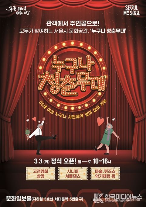 [ 한국미디어뉴스 이원영 기자 ] 서울시는 어르신들이 편하고 즐겁게 머물 수 있는 문화쉼터 ‘누구나 청춘무대’를 3일부터 정식 운영한다고 밝혔다. ‘누구나 청춘무대’는 55세 이상 어르신이면 누구나 무료로 공연과 영화를 관람하고 다양한 체험 프로그램에 참여할 수 있는 열린 문화공간이다.