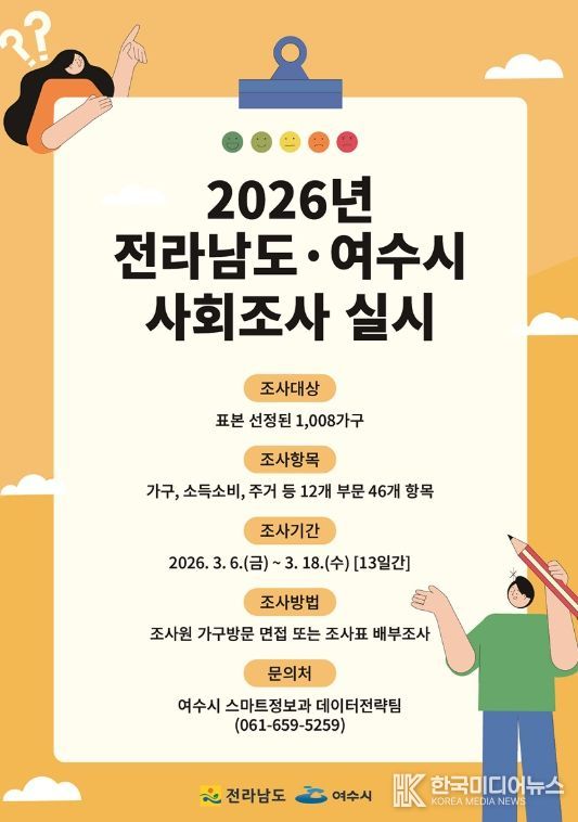 [ 한국미디어뉴스 이종철 기자 ] 여수시는 3월 6일부터 3월 18일까지 13일간 ‘2026년 전라남도·여수시 사회조사’를 실시한다고 밝혔다.
