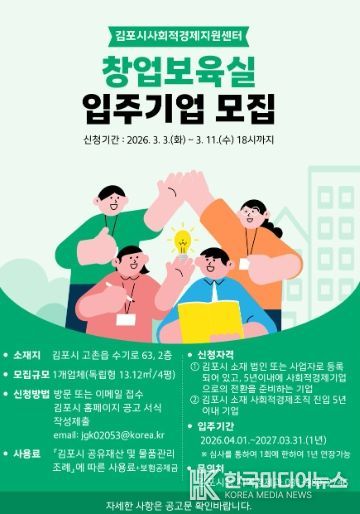 [ 한국미디어뉴스 이원희 기자 ] 김포시는 사회적 가치를 실현하는 초기 사회적경제기업의 안정적인 운영 및 성장을 지원하기 위해 오는 3월 3일부터 11일까지 사회적경제지원센터 창업보육실 입주기업을 모집한다.