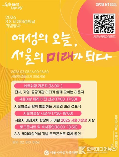[ 한국미디어뉴스 이원영 기자 ] 서울시여성가족재단이 3월 8일 세계여성의 날을 기념하여 여성 리더십의 가치를 공적으로 인정하고 민관 협력을 다지는 ‘2026 3.8 세계여성의 날 기념행사’를 개최한다.