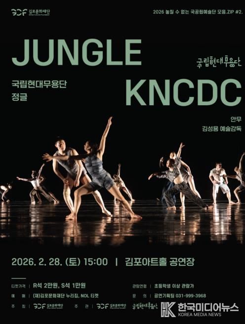 유럽과 아시아 등 국내·외 다양한 무대에서 호평을 받아온 국립현대무용단의 대표 레퍼토리 중 하나인 '정글'은 국립현대무용단 김성용 단장 겸 예술감독이 개발한 비정형적 움직임 리서치 ‘프로세스 인잇(Process Init)’을 활용한 작품으로, 몸의 본능과 생명력이 치열하게 맞부딪히는 정글이라는 상징적 공간을 통해 인간 내면의 감각과 에너지를 입체적으로 그려내며 김포시민들의 몰입과 호응을 이끌어냈다.