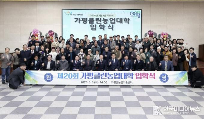[ 한국미디어뉴스 김서안 기자 ] 가평클린농업대학이 3일 농업기술센터 3층 대강당에서 ‘2026년 제20회 가평클린농업대학 입학식’을 열고 76명의 신입생을 맞았다. 입학식에는 농식품학과, 스마트농업과, 농촌관광과 입학생과 내빈 및 관계자 등 90여명이 참석해 새로운 출발을 축하했다.