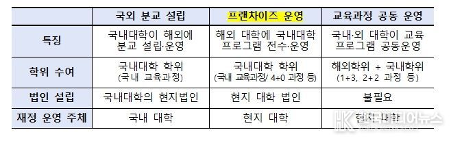 교육부는 그간 대학의 해외 진출을 지원하기 위해 관련 규제를 정비해 왔다. 기존의 사전 승인 중심 운영체계를 개편하여 대학 간 협약을 기반으로 프랜차이즈 운영이 가능하도록 개선하고, 교육과정 구성과 수업 운영은 대학 자율로 정하도록 하여 실행력을 높였다. 이번 사례는 이러한 제도 개선의 결실이며, 국립대학으로는 첫 번째이다.