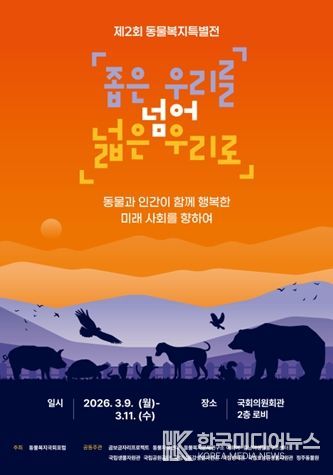 [ 한국미디어뉴스 이종철 기자 ] 기후에너지환경부 산하 국립호남권생물자원관은 국내 동물이 겪는 실태를 알리고 선진 동물복지 사회로의 발전 필요성을 공유하고자 여러 기관과 협력해 동물복지특별전 ‘좁은 우리를 넘어 넓은 우리로’를 3월 9일부터 11일까지 국회의원회관 2층 로비에서 개최한다.