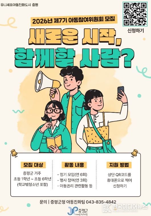 [ 한국미디어뉴스 김풍옥 기자 ] 충북 증평군이 아동의 시선에서 지역 정책을 함께 만들어갈 ‘제7기 증평군 아동참여위원회’ 위원 35명을 오는 3월 31일까지 공개 모집한다.