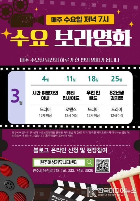 [ 한국미디어뉴스 이원영 기자 ] 원주시여성커뮤니티센터는 여성의 역량 강화와 지역 내 소통 활성화를 위해 매달 다양한 프로그램을 운영하고 있다. 특히 매주 수요일 저녁 7시 진행되는 ‘수요보라영화관’은 시민들에게 큰 호응을 얻고 있다.