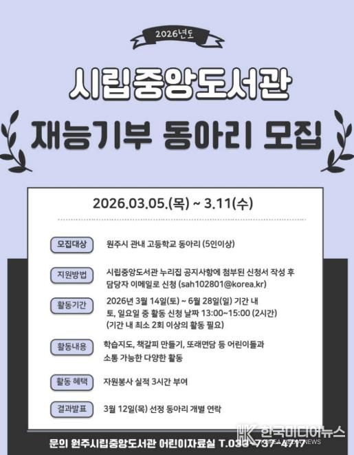 [ 한국미디어뉴스 이원영 기자 ] 원주시립중앙도서관은 올해 상반기 청소년 재능기부 동아리 봉사활동에 참여할 관내 고등학교 동아리 학생들을 모집한다.