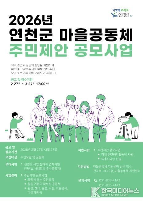 [ 한국미디어뉴스 김서안 기자 ] 연천군이 주민 모임과 공동체를 대상으로 ‘2026년 연천군 마을공동체 주민제안 공모사업’ 참여단체를 모집한다.