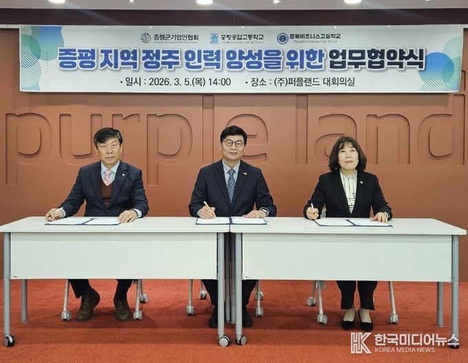 협회는 5일 퍼플랜드 회의실에서 증평공업고등학교, 충북비즈니스고등학교와 ‘지역 정주 미래 기술 인력 양성을 위한 업무협약(MOU)’을 체결했다.
