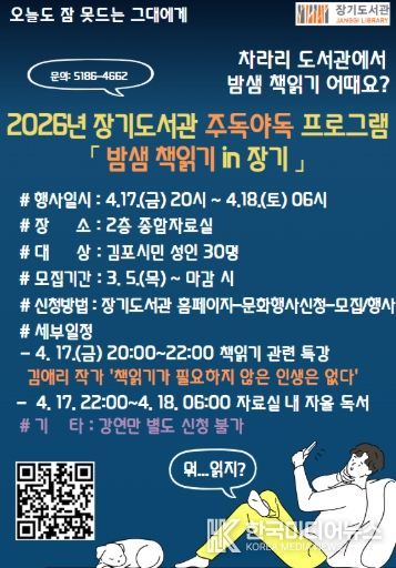 [ 한국미디어뉴스 이원희 기자 ] 김포시 장기도서관은 시민들이 책과 함께 특별한 밤을 보낼 수 있도록 오는 4월 17일 오후 8시부터 다음날인 4월 18일 오전 6시까지 도서관에서 자율적으로 독서를 하는 '밤샘 책읽기 인(in) 장기' 프로그램을 진행한다.