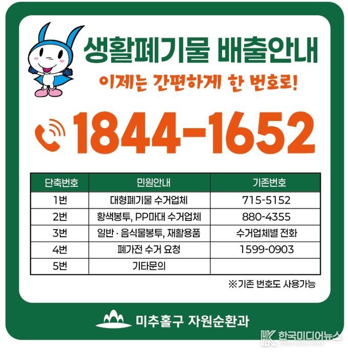 [ 한국미디어뉴스 최치남 기자 ] 인천 미추홀구가 주민들의 생활폐기물 배출 편의를 획기적으로 개선하기 위해 ‘생활폐기물 대표번호 자동응답 서비스(1844-1652)’를 3월부터 본격 시행한다고 밝혔다.