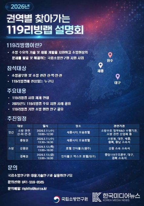 [ 한국미디어뉴스 이원영 기자 ] 소방청이 국립소방연구원이 소방 기술과 제품이 실제 재난 현장에 효과적으로 적용될 수 있도록 지원하는 ‘119리빙랩(Living Lab) 사업 설명회’를 3월 11일부터 13일까지 3일간 총 네 차례에 걸쳐 개최한다고 밝혔다.