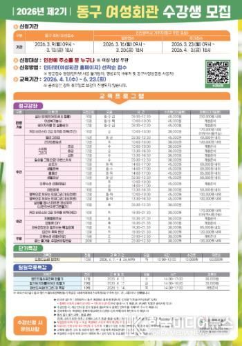 [ 한국미디어뉴스 이원희 기자 ] 인천 동구는 오는 3월 9일~4월 3일까지‘2026년 제2기 동구 여성회관’ 수강생을 모집한다고 밝혔다.