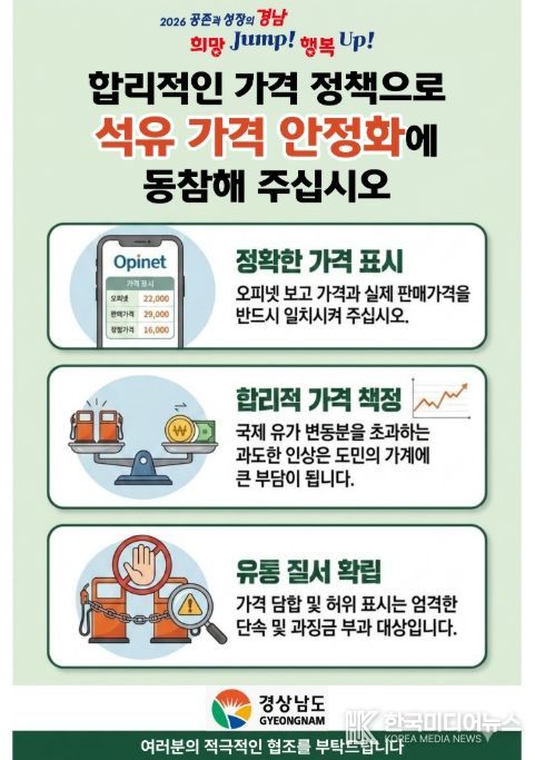 경상남도는 범정부 합동점검단에 참여해 중동 상황 발발 이전 대비 현재 가격을 과도하게 상승시킨 주유소에 대한 특별 점검을 6일부터 실시해 도내 석유 가격 안정화를 위해 면밀히 관리해 나갈 계획이다.