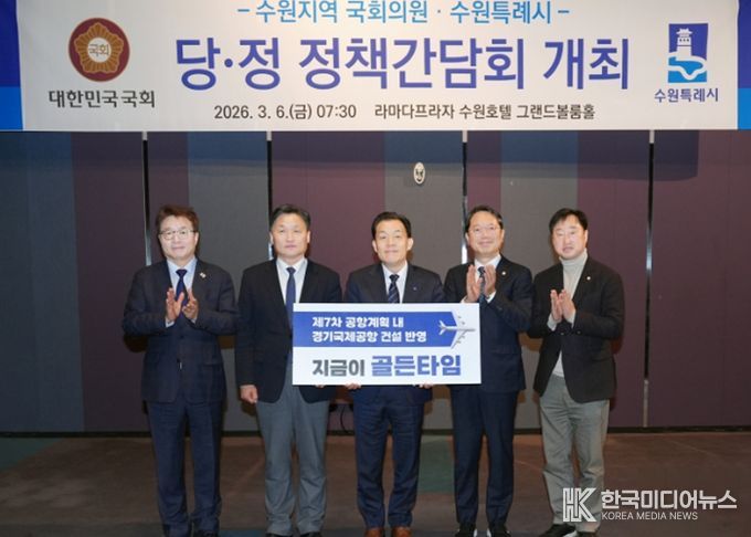 [ 한국미디어뉴스 김일규 기자 ] 이재준 수원특례시장은 6일 라마다프라자 수원호텔에서 열린 지역 국회의원들과 당·정 정책간담회에서 “제7차 공항개발 종합계획에 ‘경기국제공항’ 건설 내용이 반영될 수 있도록, 경기도와 협의해 달라”고 요청했다.