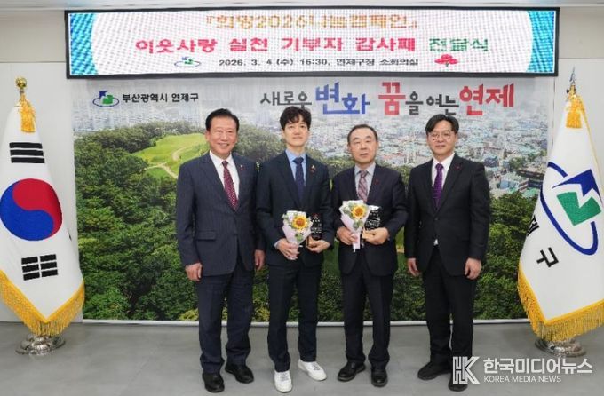 [ 한국미디어뉴스 이원영 기자 ] 연제구는 지난 3월 4일, 부산사회복지공동모금회(회장 이수태)와 함께 '희망2026나눔캠페인 이웃사랑 실천 기부자'에게 감사패를 전달했다.