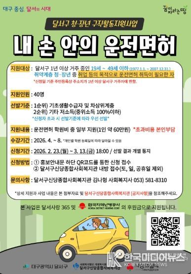 [ 한국미디어뉴스 이원영 기자 ] 대구 달서구는 취업을 준비하는 취약계층 청·장년의 구직활동을 지원하기 위해 3월부터 '내 손 안의 운전면허' 사업을 추진한다.