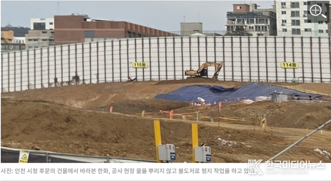 인천시청 후문 인근 민간 건물 옥상에서 바라본 한화가 시공 중인 2,500세대 아파트 공사 현장에서는 기초토목 과정에서 비산먼지를 줄이기 위한 물 뿌리기 작업이 이루어지지 않아 미세먼지가 주택가로 날아가고 있다. 공사 규정에 따르면 중장비 작업 시 살수는 필수지만, 인천시의 단속 소홀로 인해 물을 뿌리지 않는 사례가 발생하고 있다.