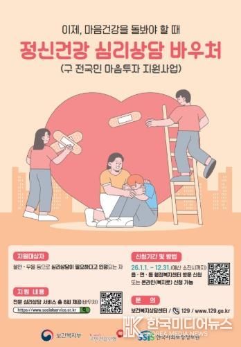 [ 한국미디어뉴스 이종철 기자 ] 정읍시가 우울감이나 불안 등 심리적 어려움을 겪는 시민들의 일상 회복을 돕기 위해 120일간 총 8회의 전문 상담을 지원하는 ‘정신건강 심리상담 바우처 사업’을 본격 운영한다.
