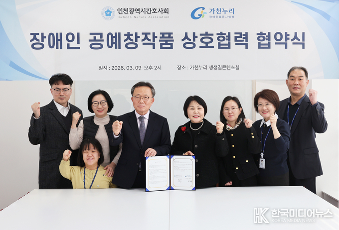 [ 한국미디어뉴스 이원영 기자 ] 가천대 길병원 장애청년사업장 가천누리와 인천광역시간호사회는 9일 오후 2시 가천누리 내 생생길콘텐츠실에서 장애 청년들의 예술적 재능 발굴과 창작품 활용, 장애 청년들의 복지 기여 및 건강 생활을 위한 업무협약을 체결했다.