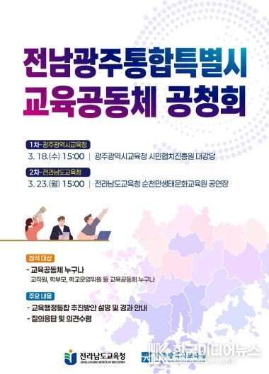 [ 한국미디어뉴스 이종철 기자 ] 전라남도교육청 ‘전남광주교육행정통합추진단’과 광주광역시교육청 ‘광주전남교육행정통합실무단’은 ‘전남광주통합특별시 교육공동체 공청회’를 3월 중 두 차례 개최한다.