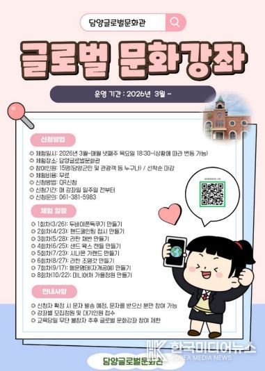 [ 한국미디어뉴스 이종철 기자 ] 담양군이 지난해에 이어 올해도 3월부터 12월까지 매월 마지막 주 목요일에 담양글로벌문화관에서 ‘글로벌 문화강좌’를 운영한다.