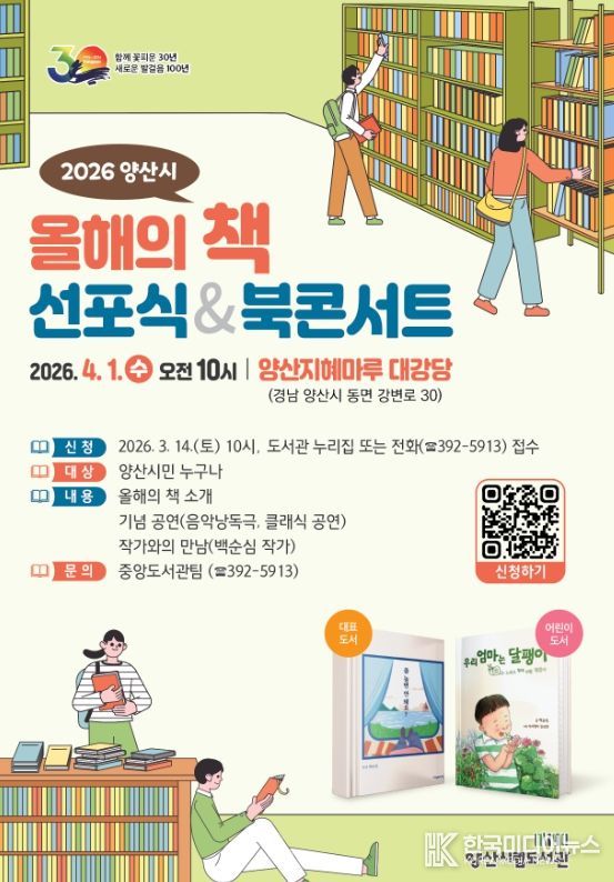 [ 한국미디어뉴스 김홍철 기자 ] 양산시립도서관은 오는 4월 1일 수요일 오전 10시, 지혜마루 대강당에서‘2026년 올해의 책 선포식 및 북콘서트’를 개최한다.