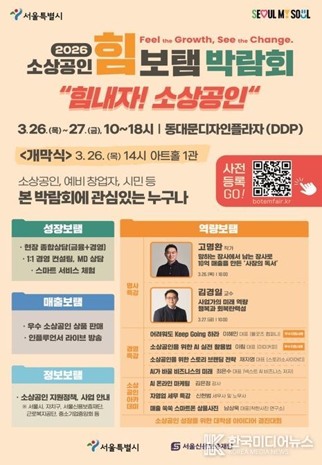 [ 한국미디어뉴스 이원영 기자 ] 서울시와 서울신용보증재단은 3월 26일부터 27일까지 이틀간 동대문디자인플라자(DDP)에서 ‘2026 소상공인 힘보탬 박람회’를 개최한다. 서울시 첫 소상공인 종합박람회로 금융·판로·교육 등 소상공인에게 필요한 정책과 정보를 총망라한 체험형 행사다.