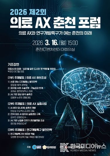 시는 오는 3월 16일 오후 3시 춘천ICT벤처센터 대회의실에서 ‘2026 제2회 의료 AX 춘천포럼’을 개최한다. 이번 포럼은 춘천시와 허영 국회의원이 공동 주최하고 강원일보가 주관하며 산·학·연·관 관계자와 시민들이 참석할 예정이다.